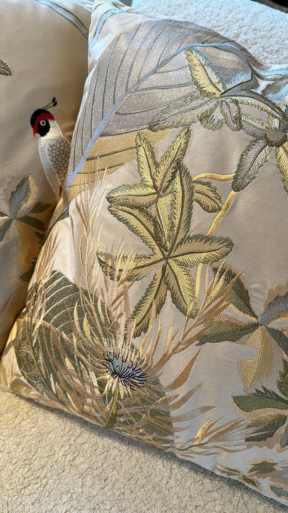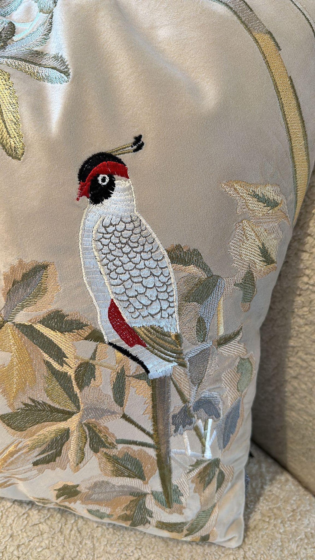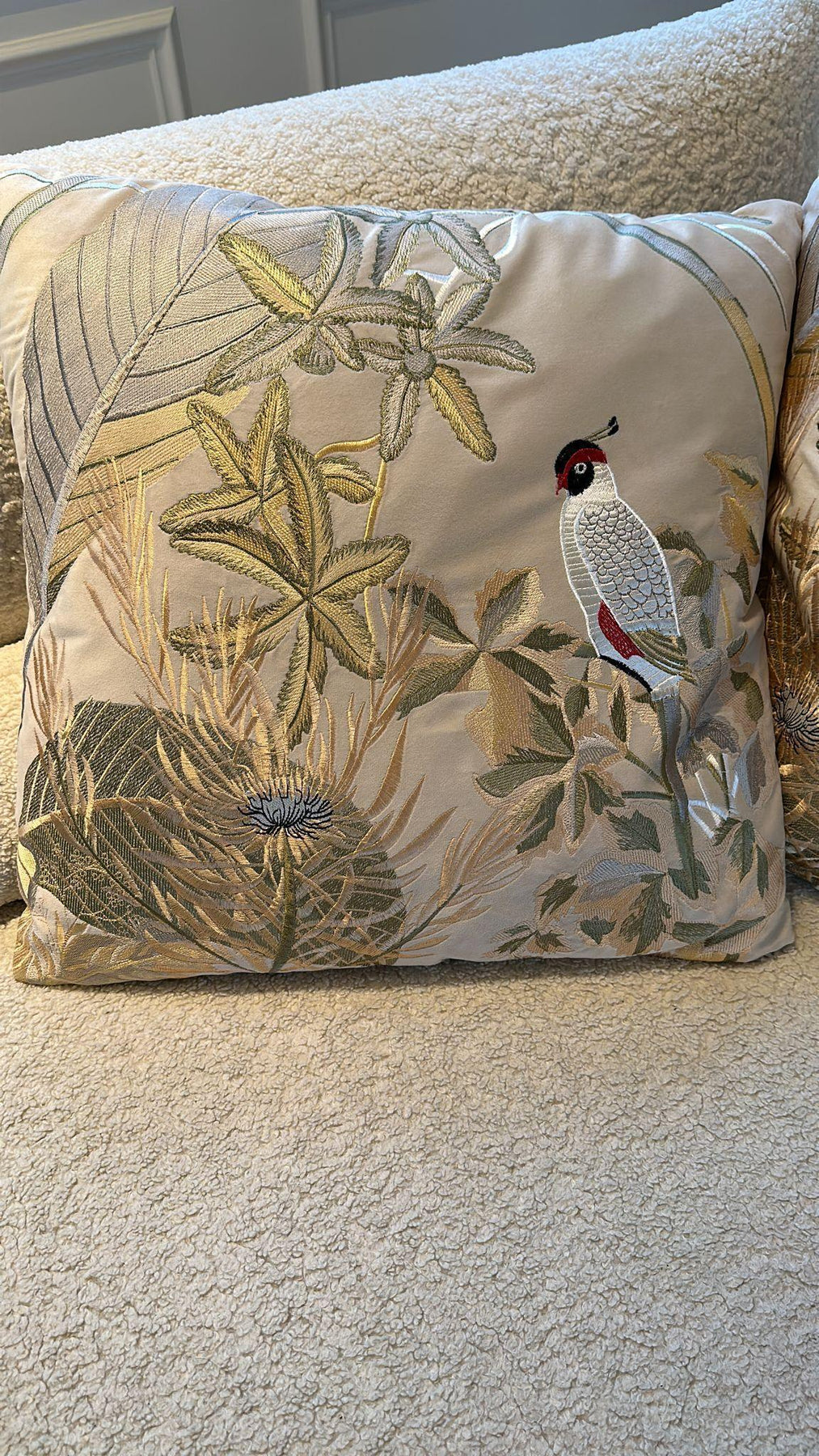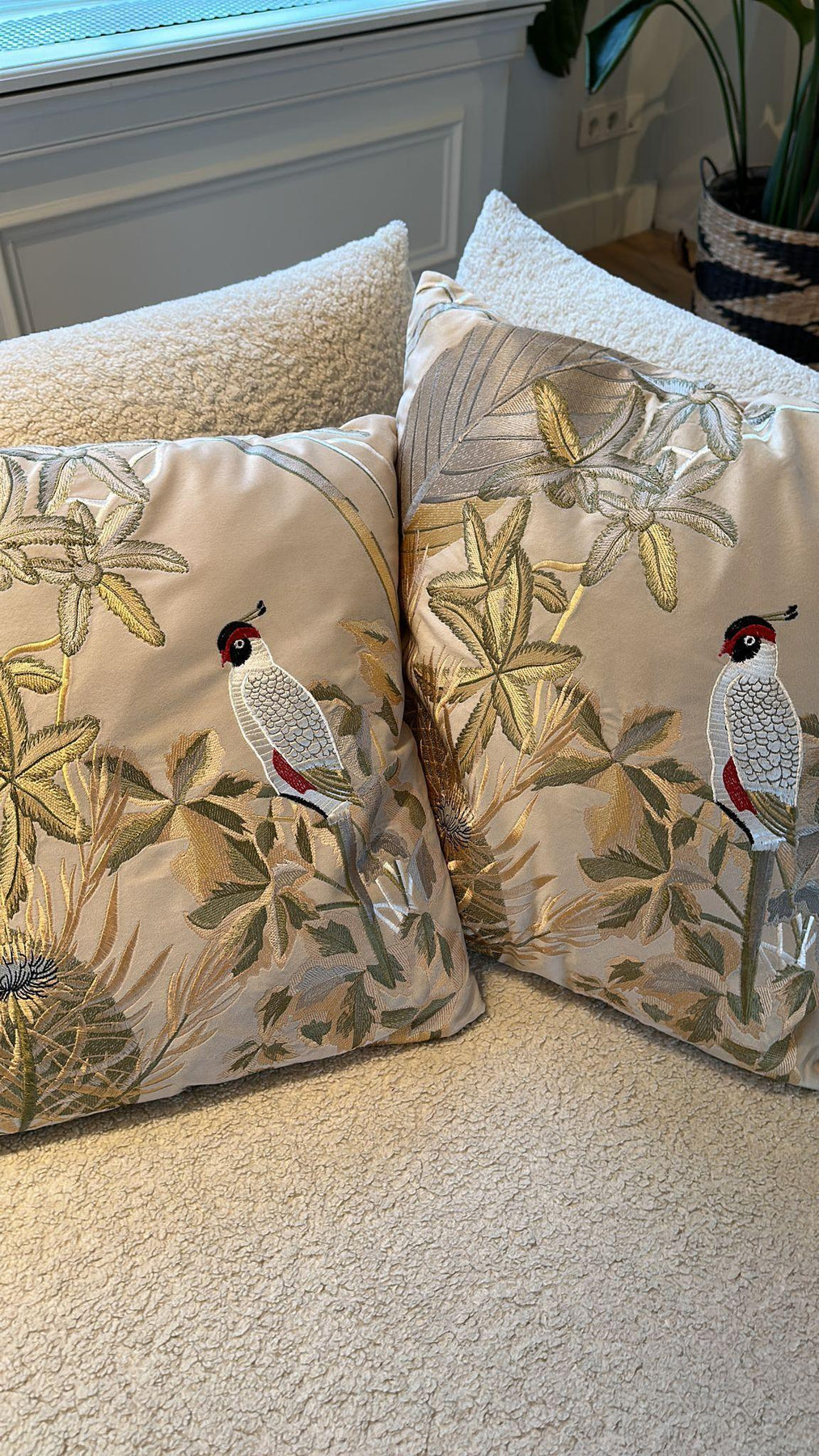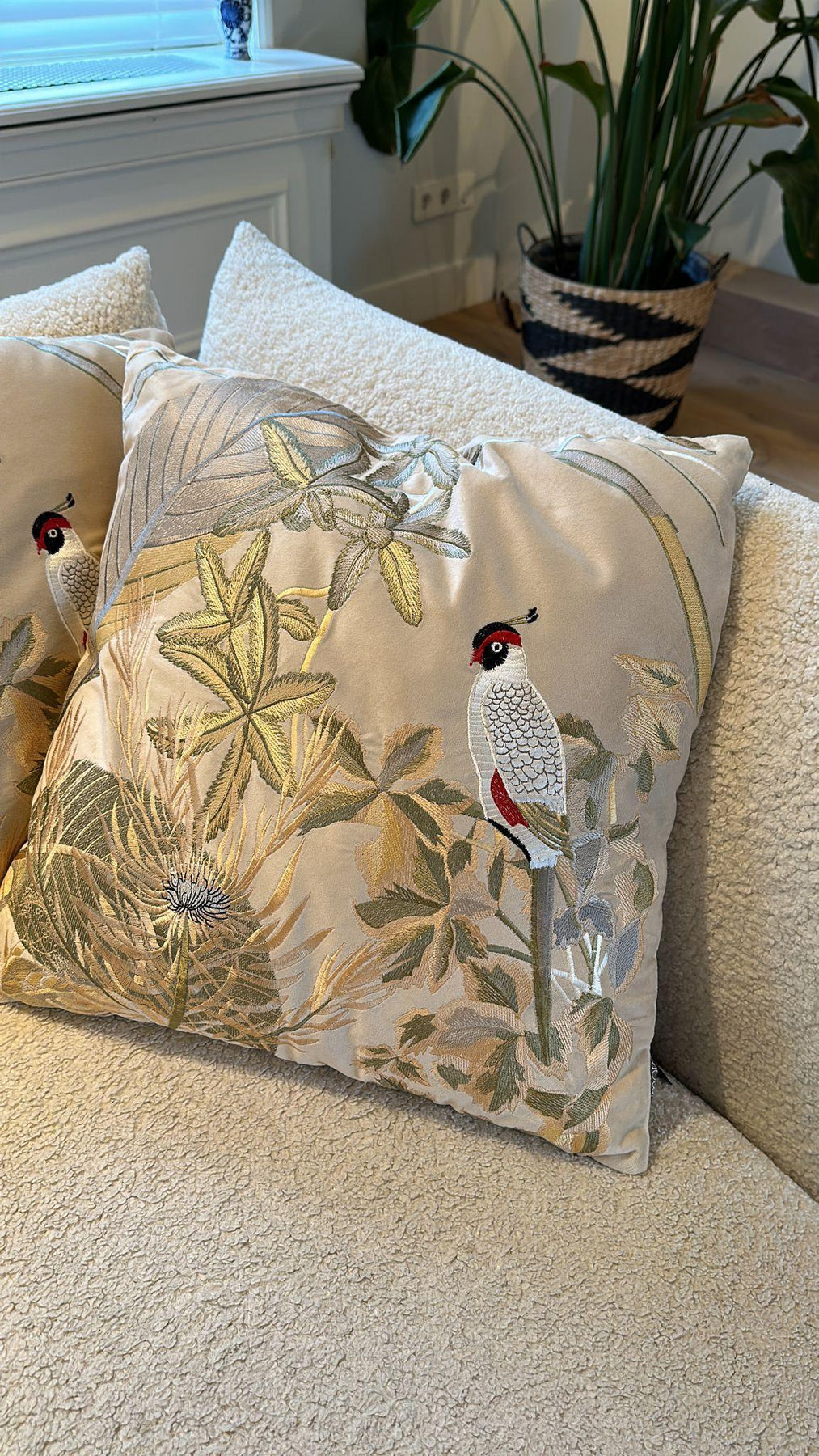Dit prachtige sierkussen heeft een Off White velvet kleur met vogelprint. Heel chique!