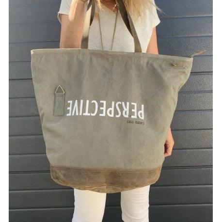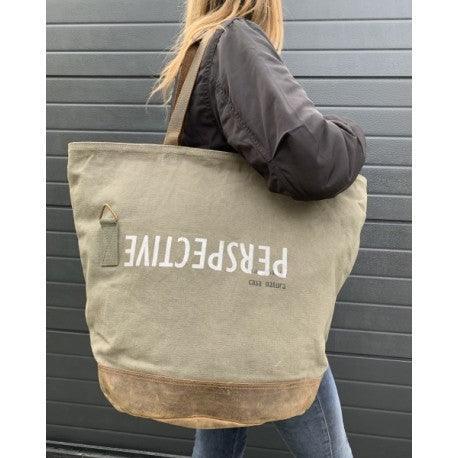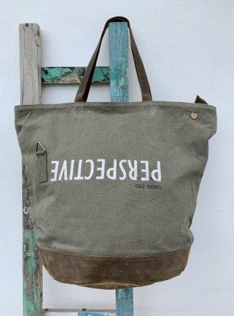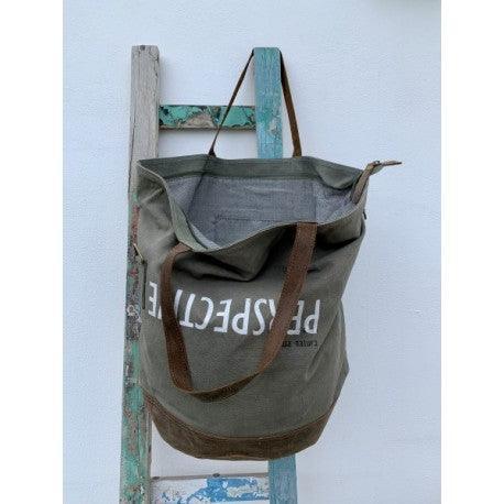 Gemaakt met nieuw canvas. Handgrepen en basis zijn van echt leer van hoge kwaliteit. Open binnenzak en ritssluiting bovenaan.